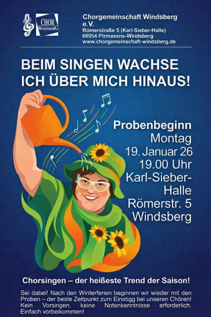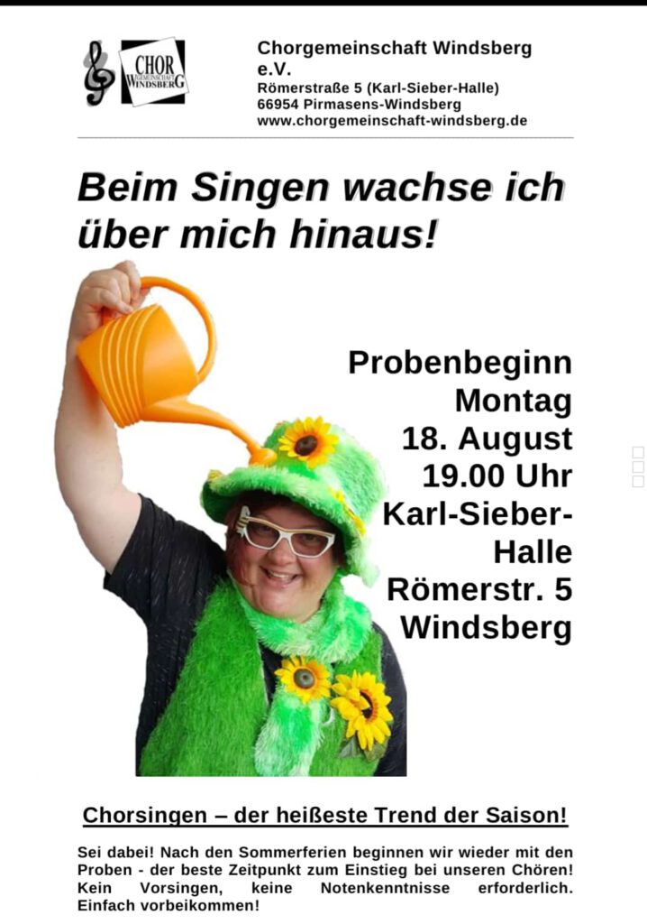 Gerne laden wir Sie ein, bei uns mitzusingen. Wir proben immer montags in der Karl-Sieber-Halle, Römerstraße 5, Pirmasens Windsberg. In der Zeit von 19.00 bis 20.30 Uhr übt der Gemischte Chor. Danach probt ab 20.30 Uhr jeweils der Frauenchor, Männerchor oder Junge Chor im wöchentlichen Wechsel. Schauen Sie einfach einmal bei unseren Proben vorbei!